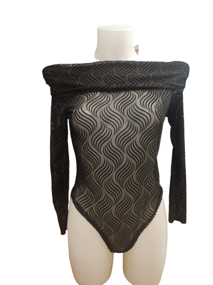 Eleganza e femminilità si incontrano in questo body trasparente con un sofisticato motivo ondulato. Lo scollo a barca esalta il décolleté, mentre il design aderente sottolinea la silhouette, rendendolo perfetto per serate speciali o outfit glamour. La taglia unica si adatta comodamente alle taglie dalla XS alla L grazie al tessuto elasticizzato.